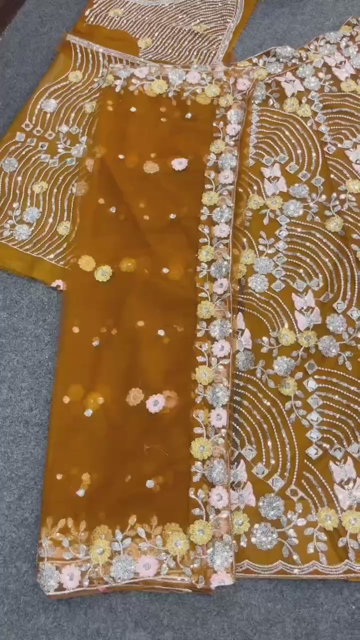 The coordinating blouse, made from the same soft butterfly net and lined for comfort, comes a stitched Blouse. Embellished with matching real mirror and sequin work, it allows you to customize your look with a perfect blend of elegance and sparkle.