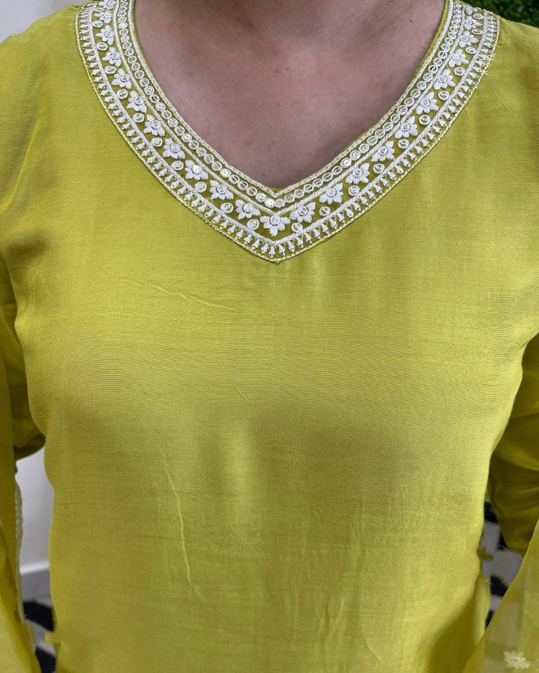Made from soft and breathable Chanderi fabric, the kurti is tailored with a Designer V-neck, 3/4 sleeves, and finished with detailed embroidery work that brings out its ethnic grace. The Organza Dupatta adds a light, flowy feel and an extra layer of sophistication.