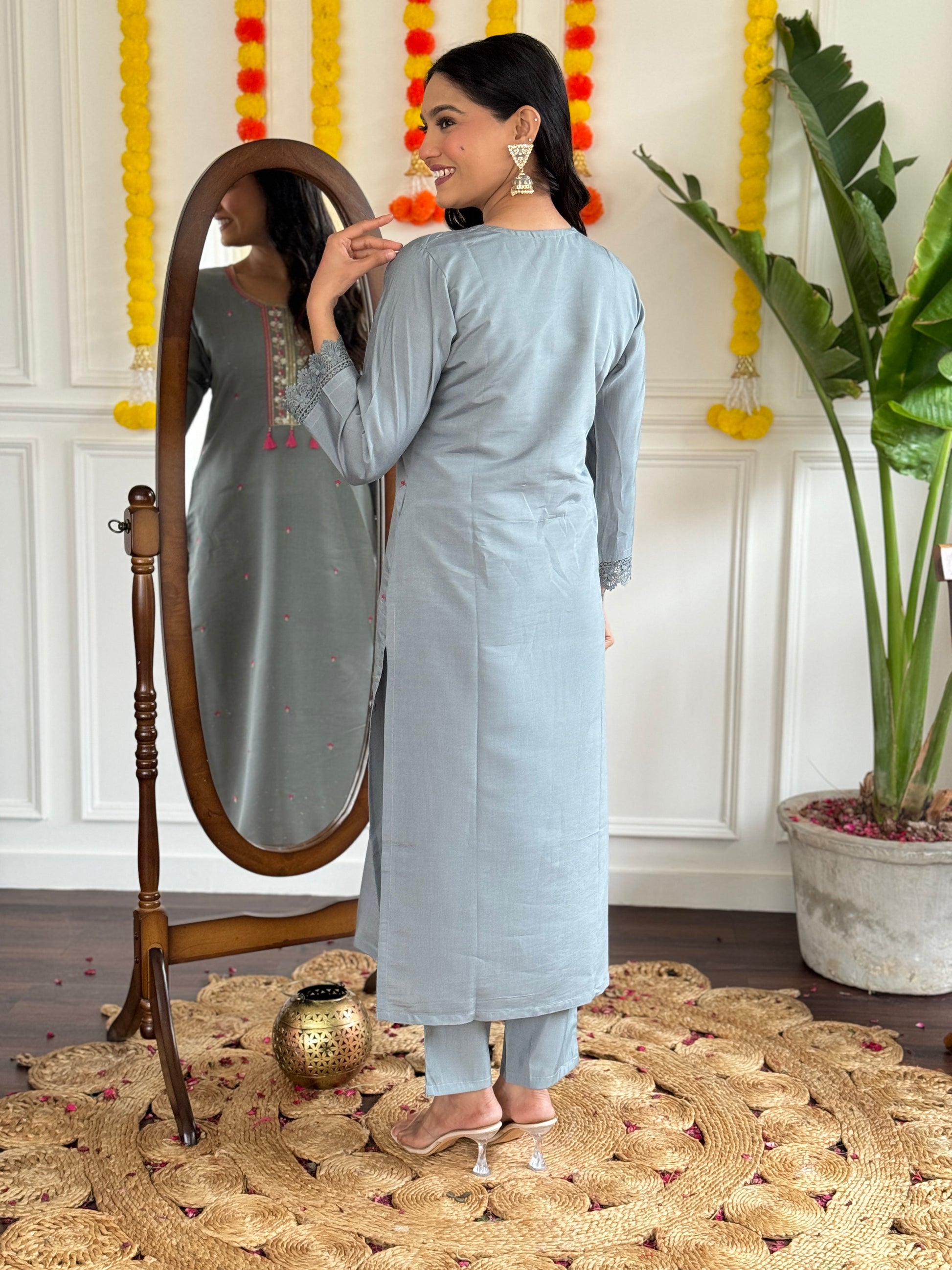 Step into subtle sophistication with this beautifully crafted 3-piece ethnic suit set, featuring breathable Viscose Chanderi fabric for both the top and bottom, and a rich Pure Linen dupatta for a refined finish. The ensemble is delicately enhanced with intricate embroidery work, making it ideal for festive gatherings, family functions, or elegant everyday wear.