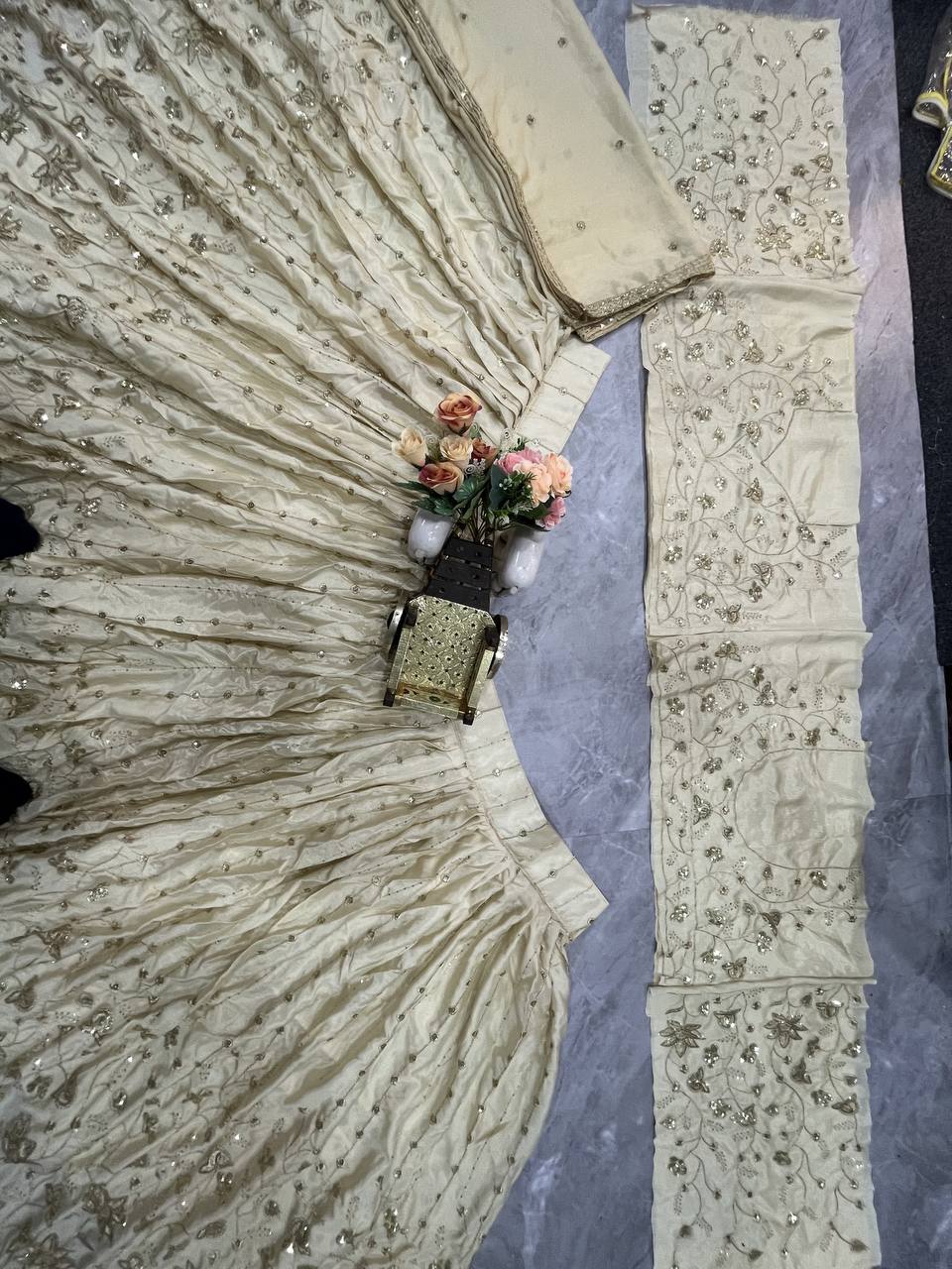 To complete the look, a 2.3-meter Chinon silk dupatta with sequin embroidered detailing adds the perfect finishing touch—ideal for graceful draping or layered styling.