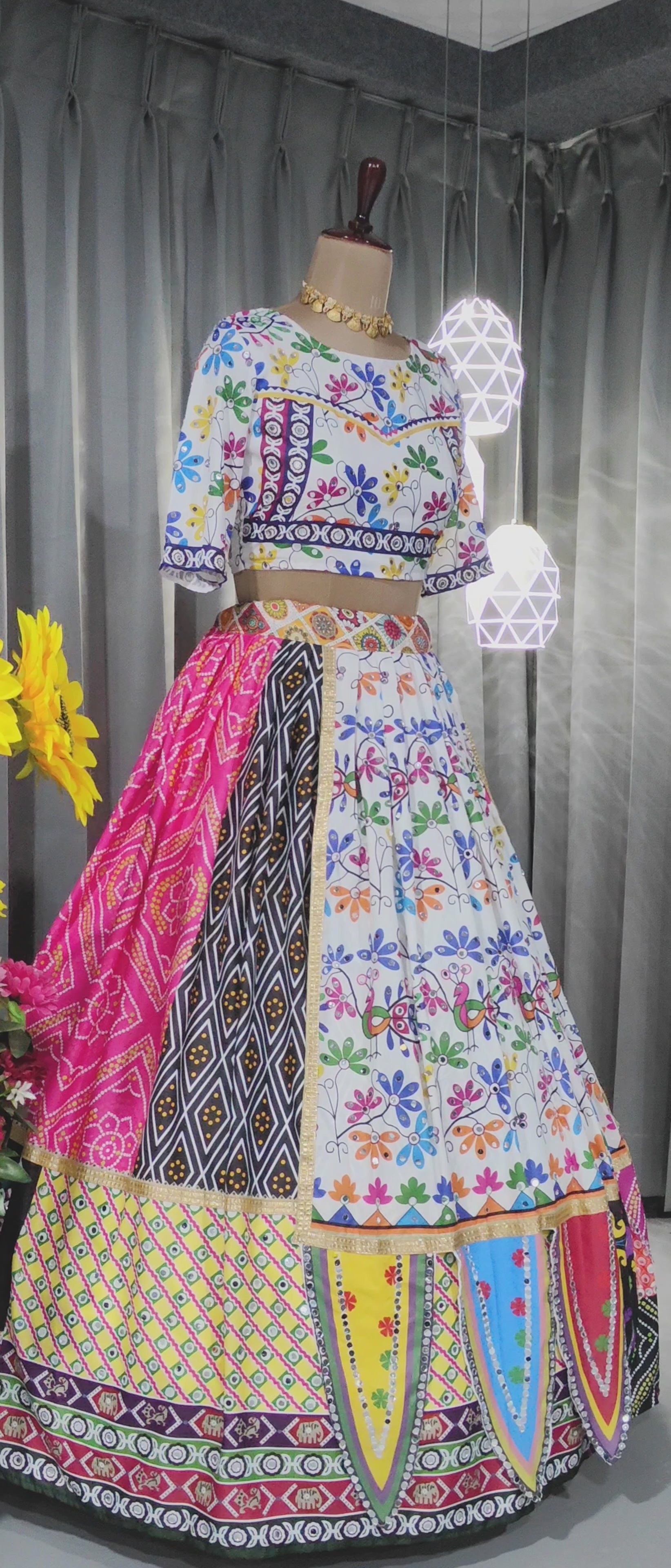 The lehenga showcases a luxurious drape in Soft Maslin Cotton, adorned with intricate fancy digital prints and shimmering real mirror work, creating a perfect blend of modern flair and traditional charm. Its 4-meter flare adds graceful volume, while the micro cotton lining ensures all-day comfort.