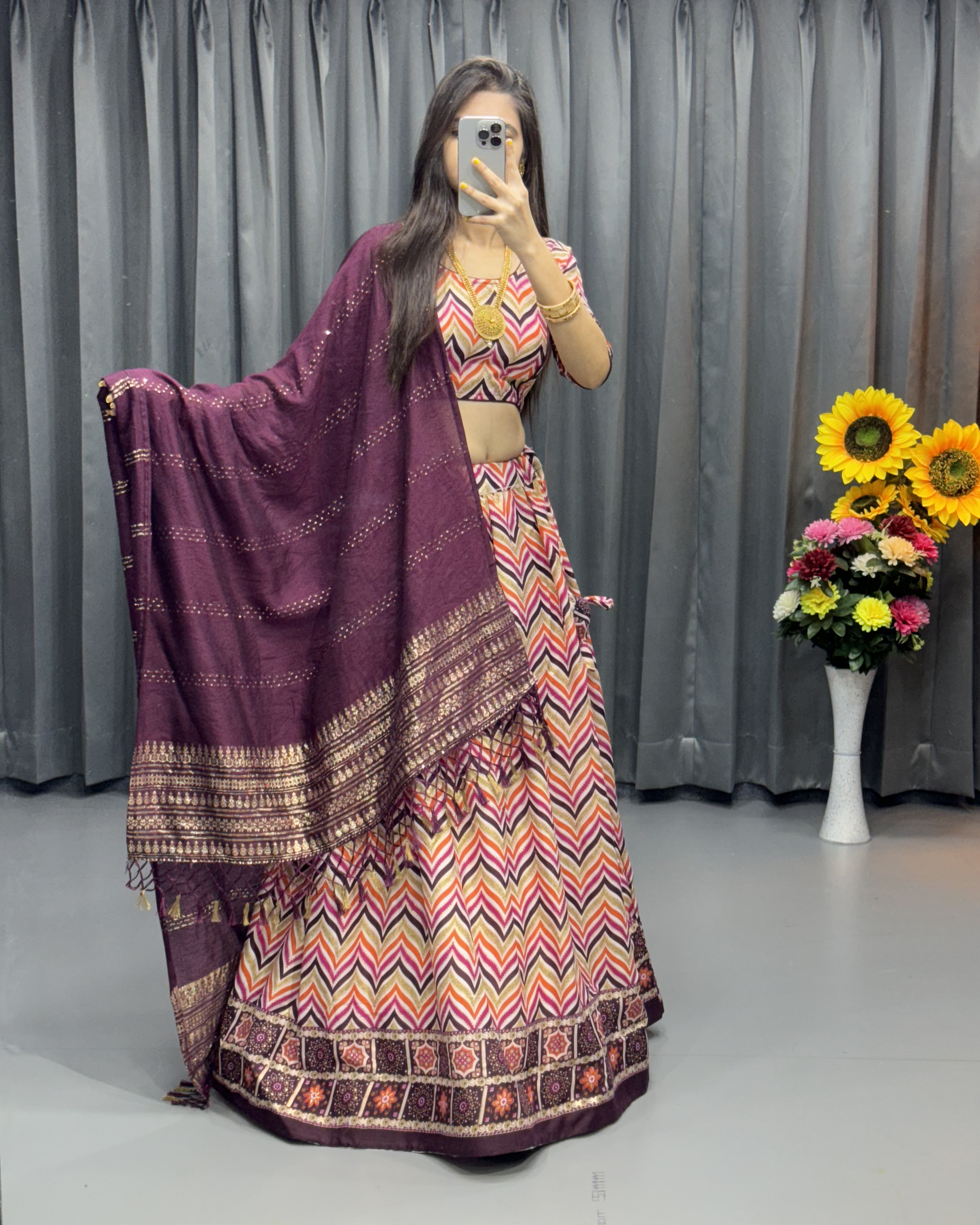 Turn heads with this beautifully designed cotton lehenga set, where modern prints meet traditional touches. The lehenga is crafted from breathable cotton fabric and features a striking ZigZag print with foil work, adding a subtle shimmer to its soft texture. Its 4-meter flare, cancan support, canvas layer, and micro cotton inner ensure comfort with volume, while the drawstring and zip closure offer a secure fit for waists up to 44 inches. The fully stitched cotton blouse comes adorned with elegant princess-style tailoring, enhanced by matching print and foil work. Sized at 38 inches with extra margin for adjustment up to 44, it includes 11" sleeves and a 15" length for a classic silhouette. Completing the ensemble is a luxurious pure Chanderi dupatta, featuring intricate zari weaving work and a fancy lace border, adding just the right amount of festive finesse. Perfect for traditional occasions, family functions, or cultural celebrations, this set is where comfort meets timeless charm.The Colour May Vary Slightly From The Picture Due To Lighting Condition.