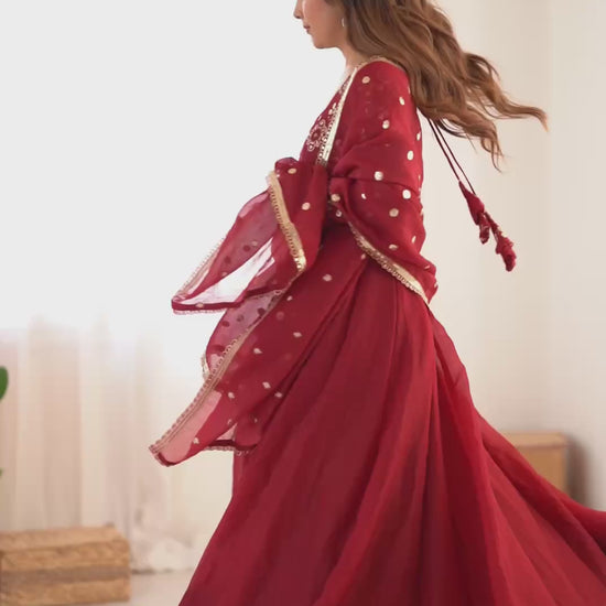 Step into timeless elegance with this premium Crunchy Silk gown set, designed for women who love a blend of tradition and sophistication. The fully flared gown, crafted with a lace border and luxurious texture, pairs beautifully with a matching pant and an embroidered dupatta for a regal, ready-to-wear look.
