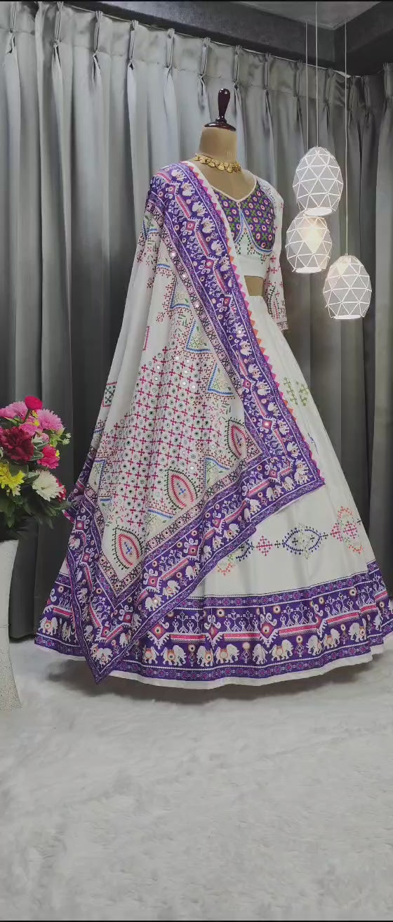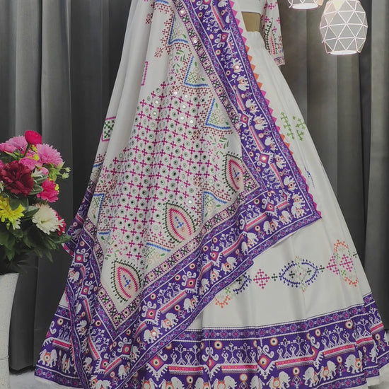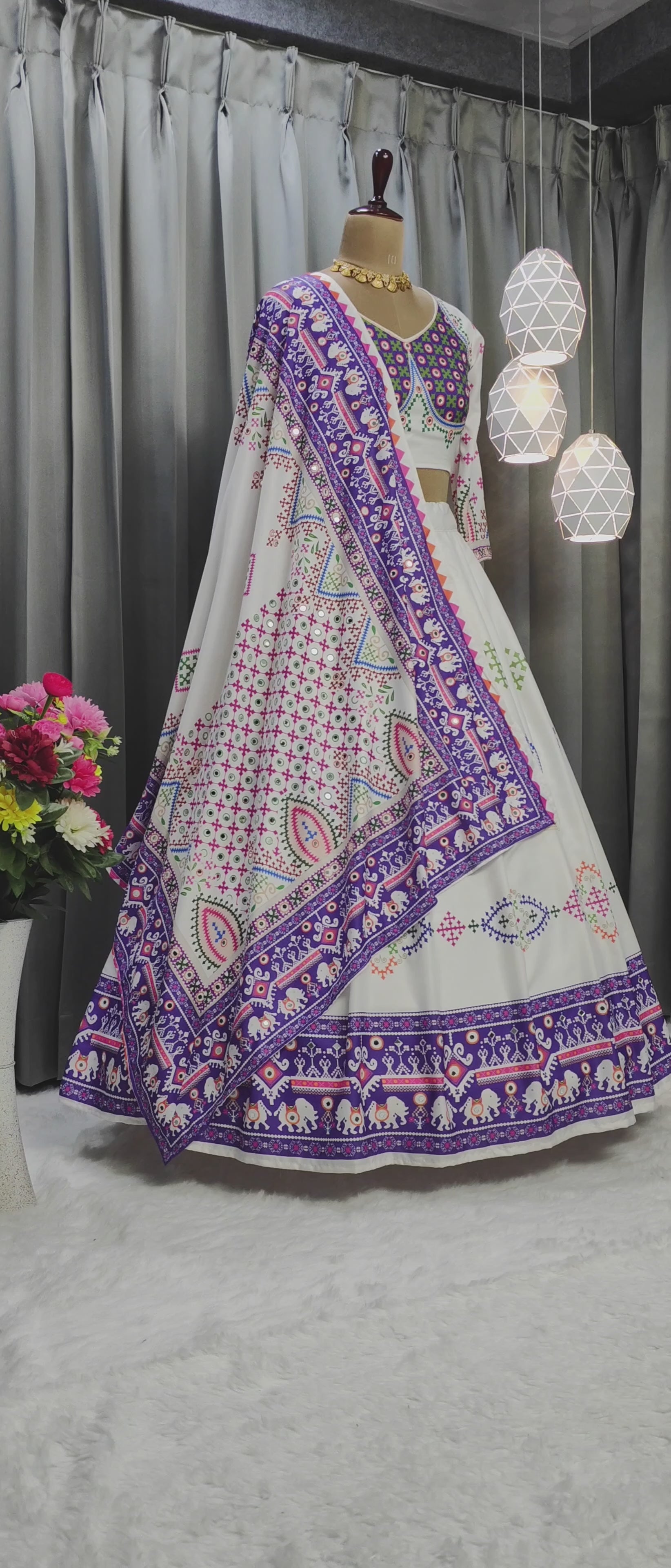 The lehenga showcases a luxurious drape in soft butter silk, adorned with intricate fancy digital prints and shimmering real mirror work, creating a perfect blend of modern flair and traditional charm. Its 4-meter flare adds graceful volume, while the micro cotton lining ensures all-day comfort.