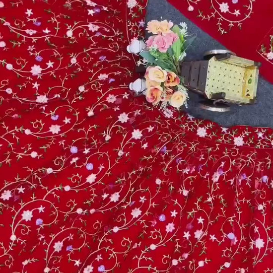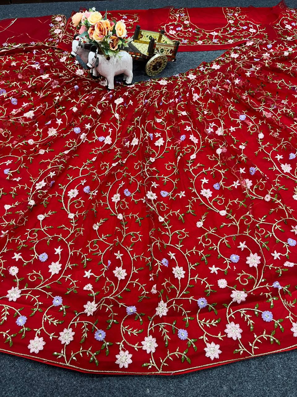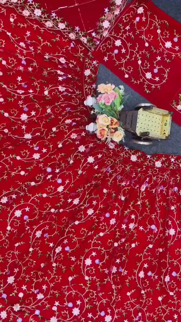 The semi-stitched lehenga is designed to fit up to size 44 comfortably, with a length of 42 inches for a perfect drape. Complementing the lehenga is a beautifully embroidered blouse made from premium quality butterfly net, available stitched Blouse for personalized tailoring.
