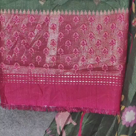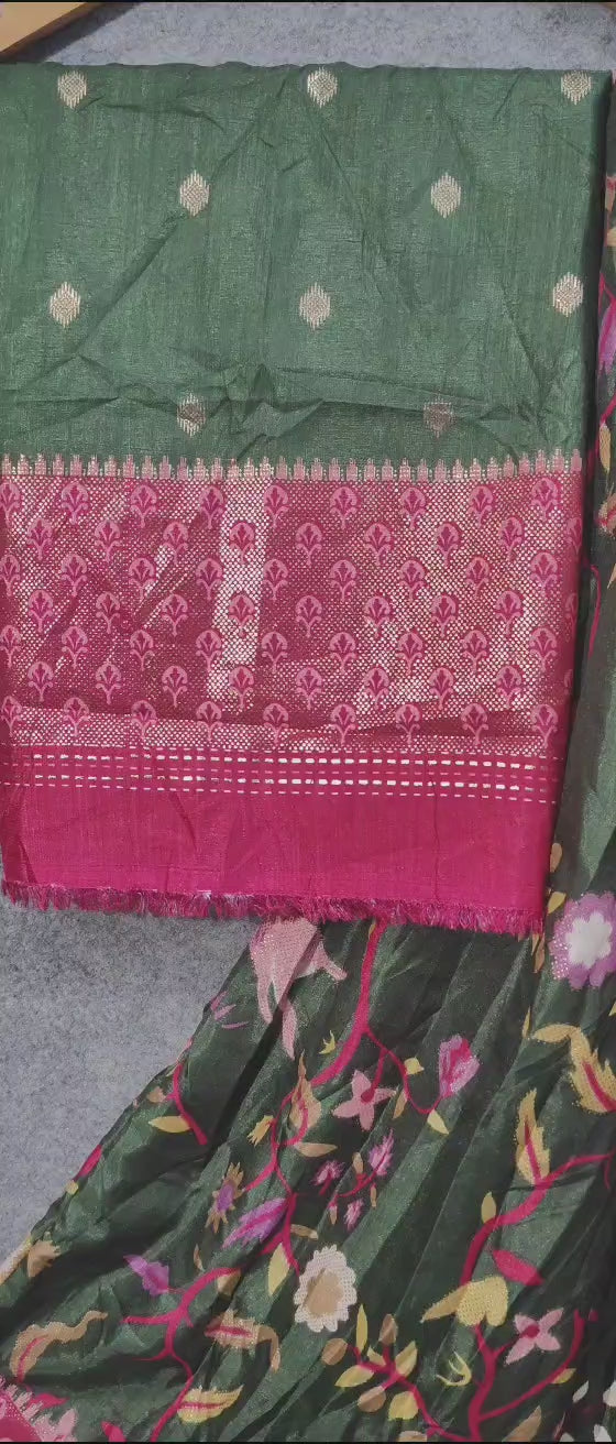 The matching fully stitched blouse in Tussar silk features subtle foil work and fits up to 42 inches. Completing the set is a 2.5-meter dupatta in matching floral print, finished with tassels on both sides for a refined ethnic touch.