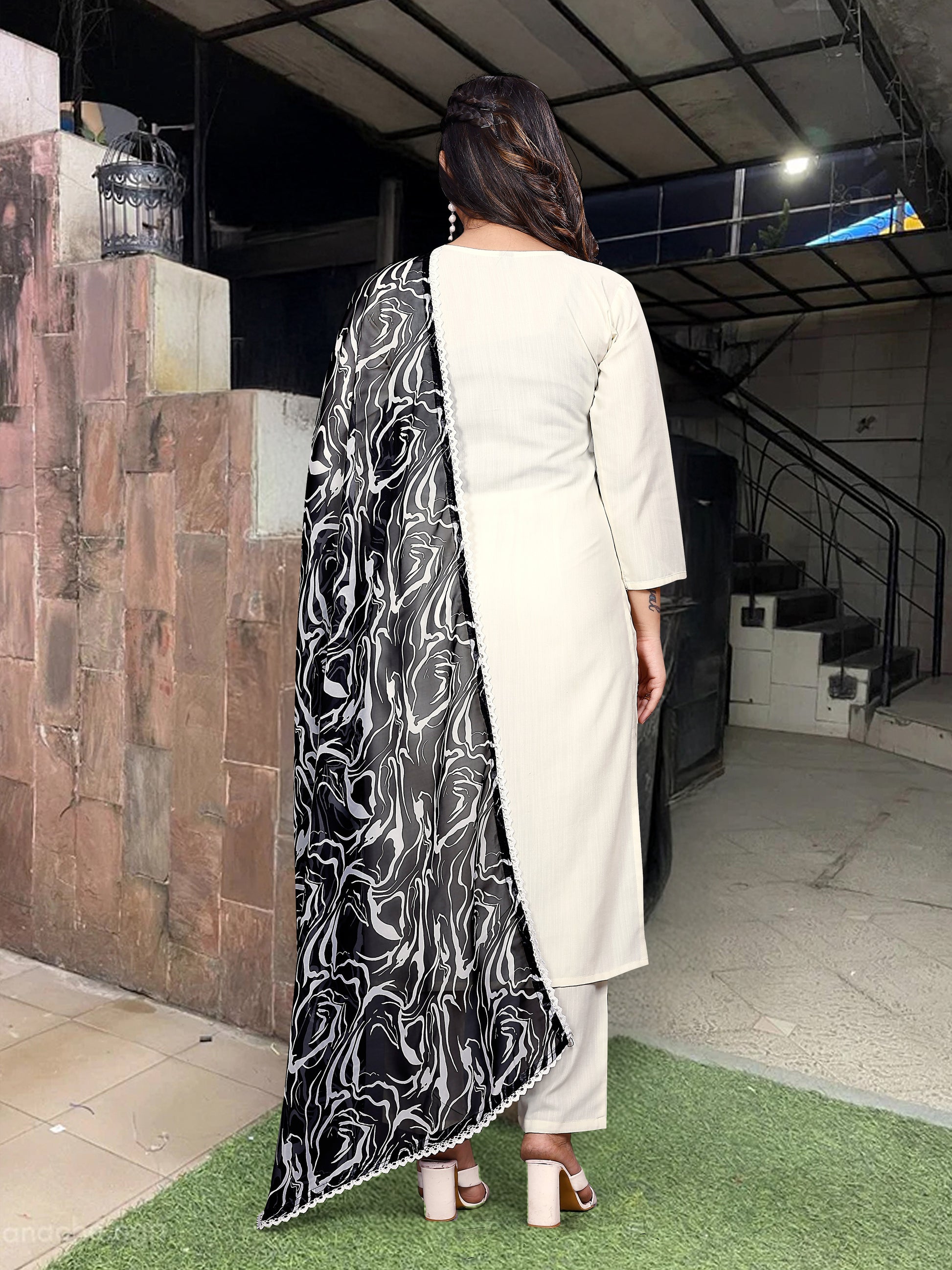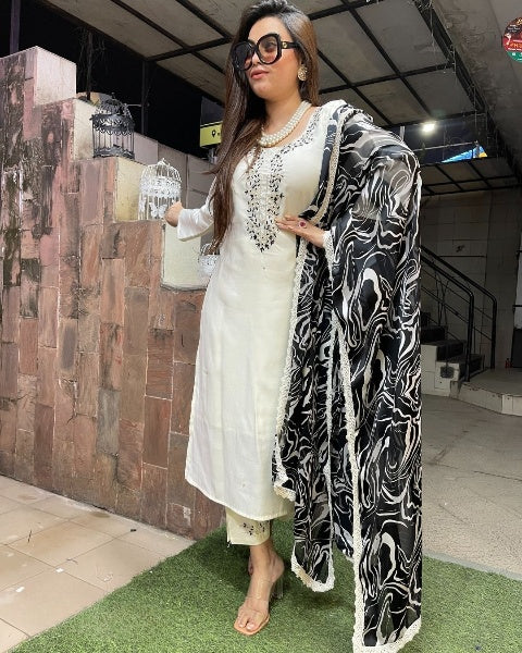 Embrace refined elegance with this stunning Viscose Blend Rayon Suit Set, thoughtfully crafted for comfort, grace, and effortless style. This 3-piece ensemble includes an embroidered kurti, matching pants, and a flowy Nylon Taby Organza dupatta with a soft sheen and airy feel — perfect for festive wear, semi-formal occasions, or traditional gatherings.