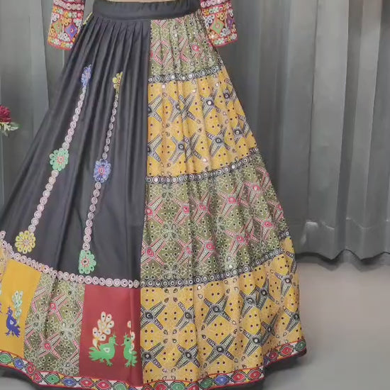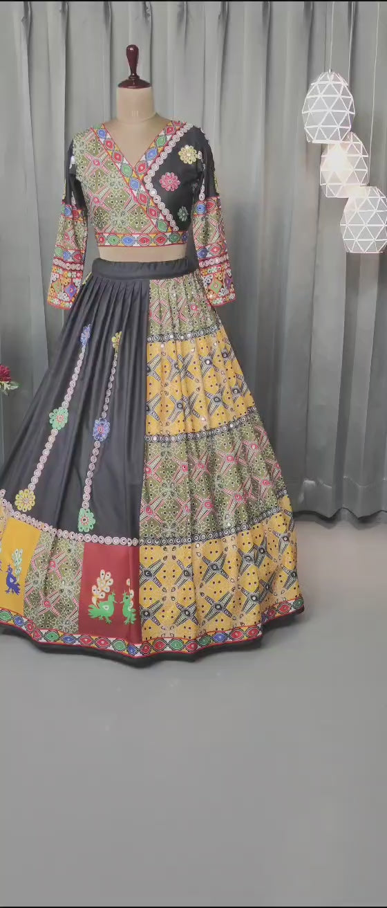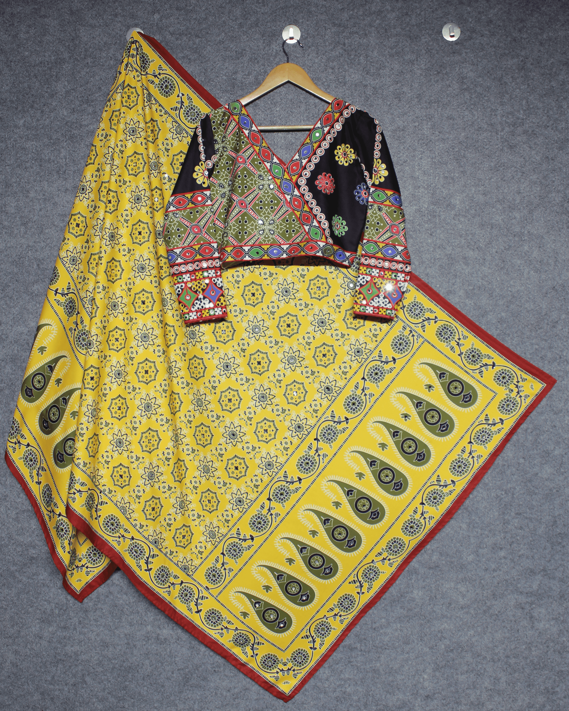 Women’s Stitched Butter Silk Lehenga Choli – Real Mirror Work & Digital Print | Navratri Special