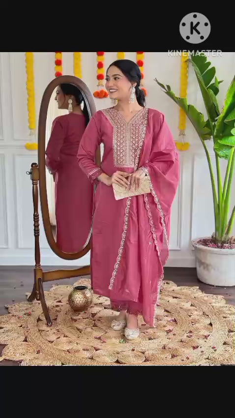 Women’s Viscose Chanderi Kurti Set with Embroidered Nylon Chanderi Dupatta & Pant – Full Sleeves, Designer V Neck