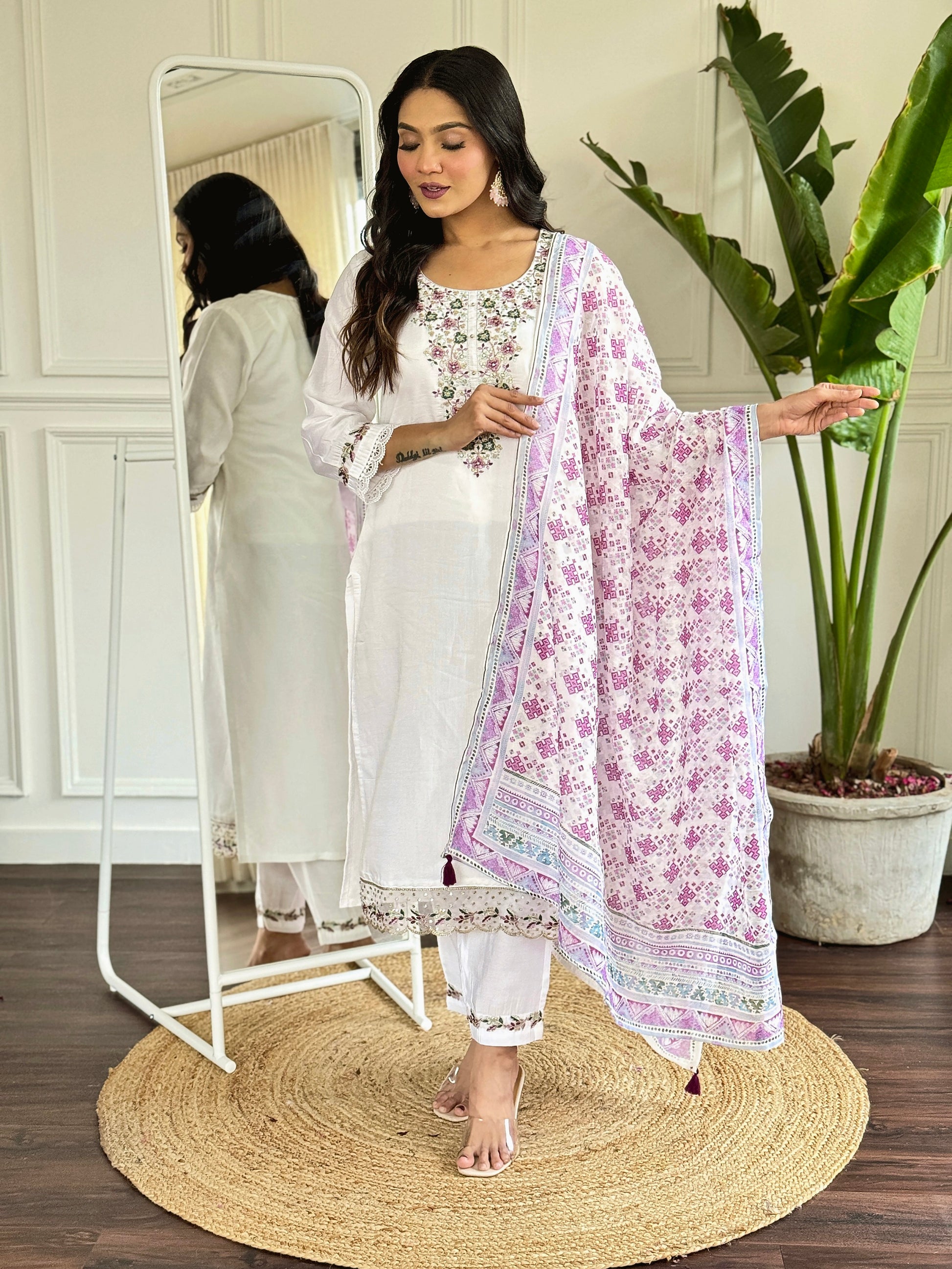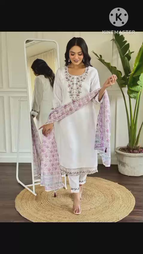 Women's Elegant White Kurti Pant Set in Viscose Chanderi Fabric with Lightweight Clinen Dupatta | Festive & Casual Wear