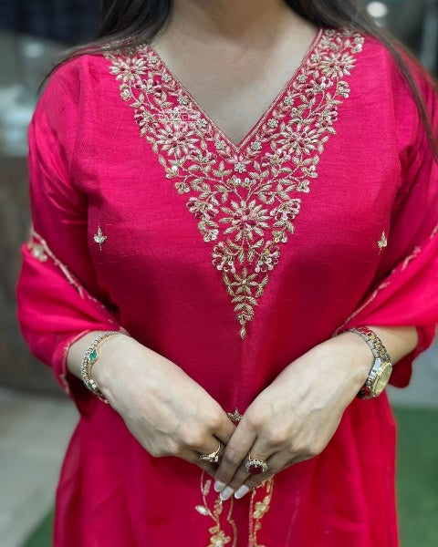 Make a sophisticated statement with this luxurious Viscose Chanderi Suit Set, designed to bring elegance and comfort together. Ideal for festive events, parties, or graceful daywear, this 3-piece ensemble blends premium fabrics with exquisite craftsmanship.